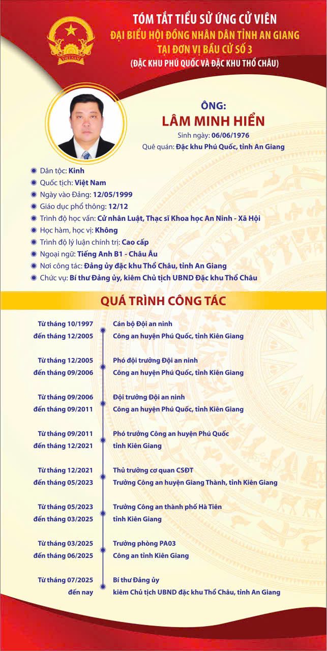 aA Đảng - Đoàn thể Tóm tắt tiểu sử ứng cử viên Đại biểu HĐND tỉnh An Giang khóa XVI, nhiệm kỳ 2026 - 2031 Ông Lâm Minh Hiển 05/03/2026, 14:41 Quay về Chia sẻ Z Copy link thành công Tin khác Tiểu sử tóm tắt người ứng cử đại biểu HĐND tỉnh khóa XVI, nhiệm kỳ 2026 - 2031 Bà Trần Thị Kim Thúy Đảng - Đoàn thể 06/03/2026 Tờ gấp tuyên truyền Đại hội XIV của Đảng Đảng - Đoàn thể 05/03/2026 Đại hội đại biểu Đảng bộ Ủy ban nhân dân tỉnh An Giang lần thứ I, nhiệm kỳ 2025 – 2030 Đảng - Đoàn thể 28/08/2025 Hành trình tình nguyện đến vùng biên giới An Giang Đảng - Đoàn thể 28/08/2025 An Giang: Đảm bảo an ninh, trật tự dịp Lễ Quốc khánh 2/9 Đảng - Đoàn thể Hoạt động HDND - UBND Kinh tế - Hạ tầng An sinh - Xã hội Quốc phòng - An Ninh 26/08/2025 Xã đoàn Tân Thạnh, Chi đoàn Đồn Biên Phòng Xẻo Nhàu tuyên truyền phòng chống khai thác IUU Đảng - Đoàn thể Hoạt động HDND - UBND Kinh tế - Hạ tầng Văn hóa - Giáo dục - Y tế 08/11/2024 Thông báo khám chữa bệnh miễn phí cho khách hàng có thẻ BHYT Đảng - Đoàn thể Hoạt động HDND - UBND Kinh tế - Hạ tầng Văn hóa - Giáo dục - Y tế 19/05/2022 Tổng kết "Phong trào toàn dân bảo vệ An ninh Tổ Quốc" năm 2021 Đảng - Đoàn thể Hoạt động HDND - UBND Kinh tế - Hạ tầng Văn hóa - Giáo dục - Y tế An sinh - Xã hội 05/05/2022 /tom-tat-tieu-su-ung-cu-vien-dai-bieu-hdnd-tinh-an-giang-khoa-xvi-nhiem-ky-2026-2031-ong-lam-minh-hien